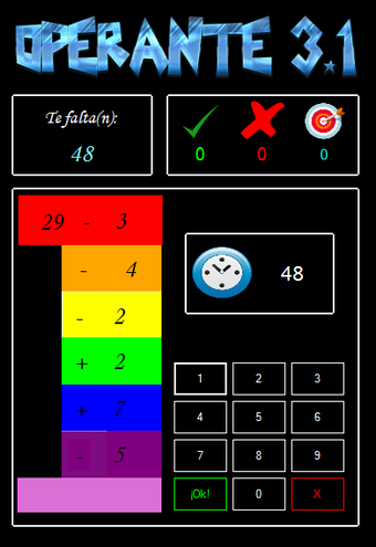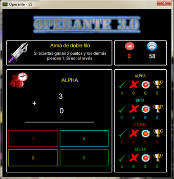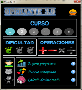 Operante es un software pensado para Educación Primaria (Siguiendo como referencia didáctica el Currículum de Educación Básica del País Vasco, modificado por el Decreto 97/2010) con el objetivo de emplear las nuevas tecnologías de una manera divertida mientras aprendemos matemáticas. Para ello existen tres modos de juego: Individual, grupal y contra el PC.